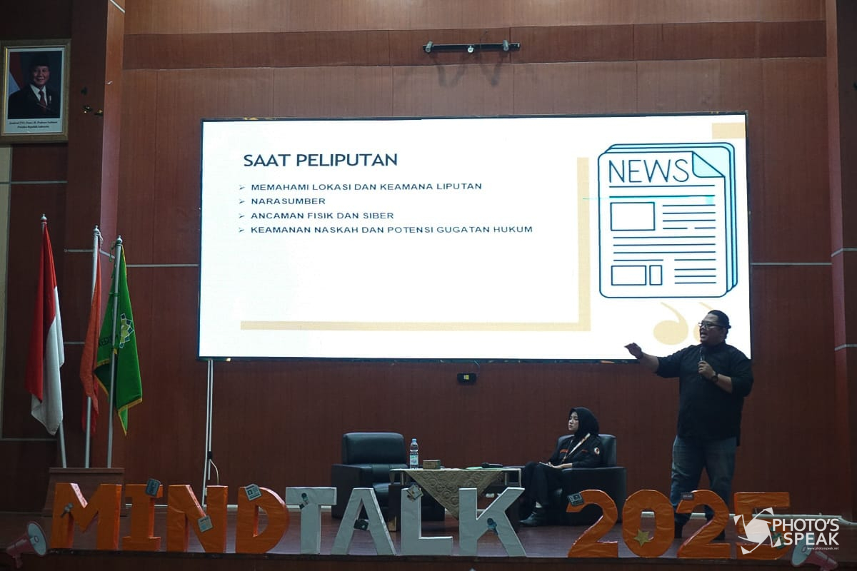 Jurnalis Kompas.com, Muhamad Elgana Mubarokah, menyampaikan materi pada Seminar MindTalk 2025 di Gedung PPG, Kampus 2 UIN Sunan Gunung Djati Bandung, Kamis (11/9/2025). Seminar MindTalk 2025 mengangkat tema “The Truth Knows No Fear, but Needs a Safe Place for Journalists.” PHOTOSSPEAK/Hilda Nurhalimah Hasanah