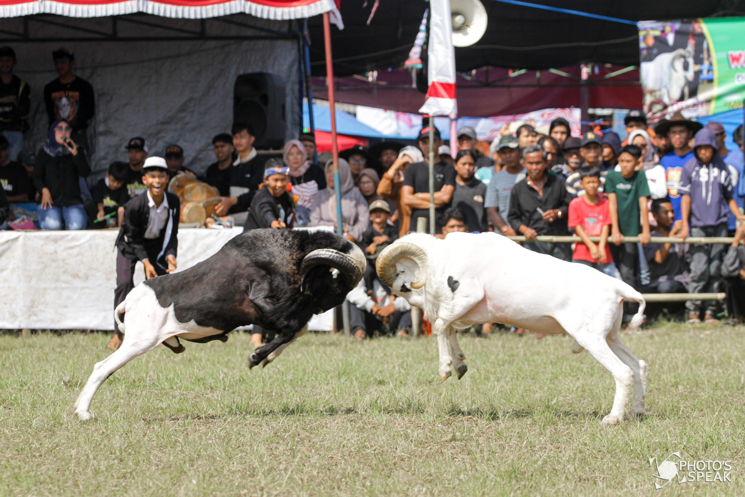 Dua ekor Domba Garut bertarung pada Milangka Kecamatan Kasomalang di Lapangan Kasomalang, Kabupaten Subang, Jawa Barat, Minggu (11/8/2024). Kegiatan tersebut diikuti oleh ratusan peternak domba dari berbagai daerah di Jawa Barat ini bertujuan untuk melestarikan budaya dan sebagai ajak pencarian domba berkualitas untuk dijual dengan nilai tinggi. PHOTOSSPEAK/Hufaz Muhammad Dzaki