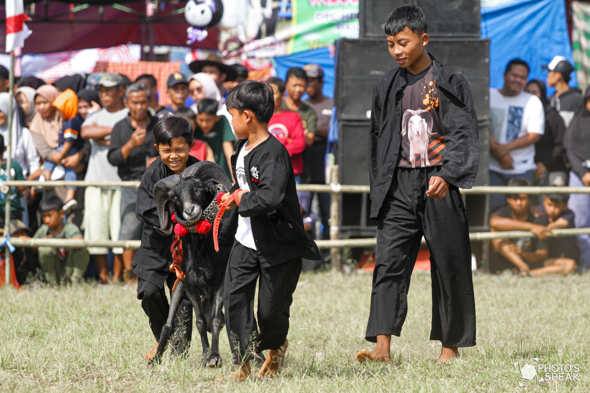 Pemilik domba memasuki lapangan adu domba di Lapangan Kasomalang, Kabupaten Subang, Jawa Barat, Minggu (11/8/2024). PHOTOSSPEAK/Hufaz Muhammad Dzaki