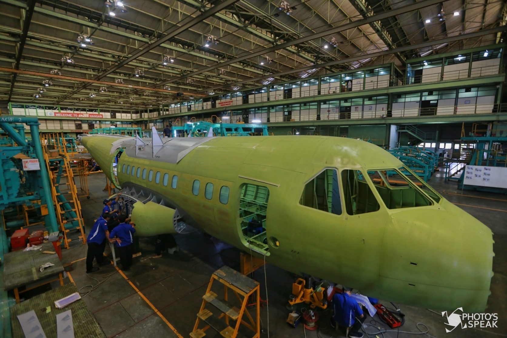 Pekerja menyelesaikan pembuatan kabin pesawat CN235 di Hangar Assembly PT Dirgantara Indonesia (PTDI) Jalan Pajajaran, Kota Bandung, Selasa (9/1/2018). Kementerian Perindustrian (Kemenperin) Republik Indonesia menargetkan realisasi investasi pada tahun 2018 di sektor manufaktur mencapai Rp. 400 triliun untuk sejumlah sektor yaitu argo, industri kimia, tekstil, industri logam, mesin, alat transportasi, dan elektronika. PHOTO’S SPEAK / Rizal Fauzi Akbar