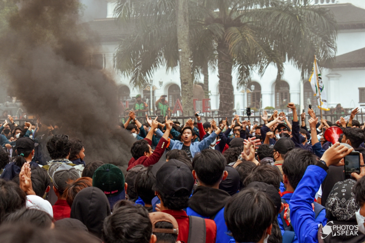 Ratusan mahasiswa menggelar aksi unjuk rasa di tengah hujan deras di depan Gedung Sate, Jalan Diponegoro, Kota Bandung, Senin (11/4/2022). Massa aksi menilai Presiden Jokowi gagal dalam pemerintahannya karena terjadi multikrisis di Indonesia seperti kenaikan harga minyak goreng, kenaikan harga Bahan Bakar Minyak (BBM), dan wacana perpanjangan masa jabatan presiden. PHOTOSSPEAK/Algifari Tohaga